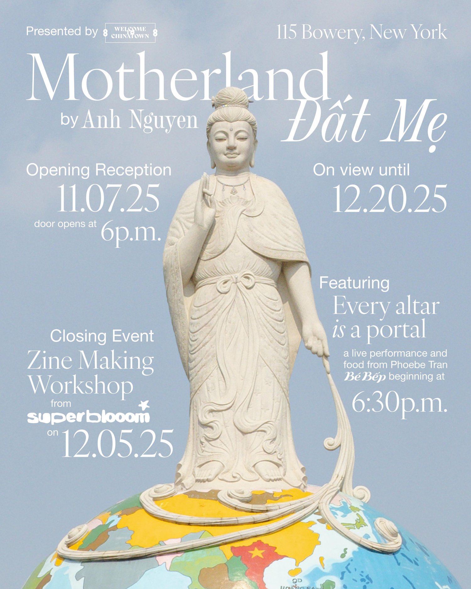 The opening reception features “Temple of Memory,” an altar and culinary performance from Phoebe Tran (@bebep.babykitchen) Performance starts at 6:30pm. There will also be a pop-up “temple canteen” serving sliding-scale Buddhist vegetarian food.